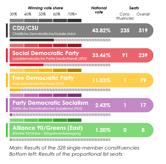 2 декабря 1990-го – впервые с 30-х годов – прошли парламентские выборы в едином немецком государстве. Христианские демократы Коля на них победили, но отнюдь не сокрушительно, как боялись социал-демократы: ХДС набрала 36,7% (плюс 7,1% союзного баварского ХСС), СДПГ – 33,5%. Больше того, все три партии потеряли от 2,3 до 3,5% – из-за того, что свою долю отхватили политсилы экс-ГДР – Партия демократического социализма (бывшая СЕПГ) и "Альянс-90" (вскоре влилась в Партию зеленых).