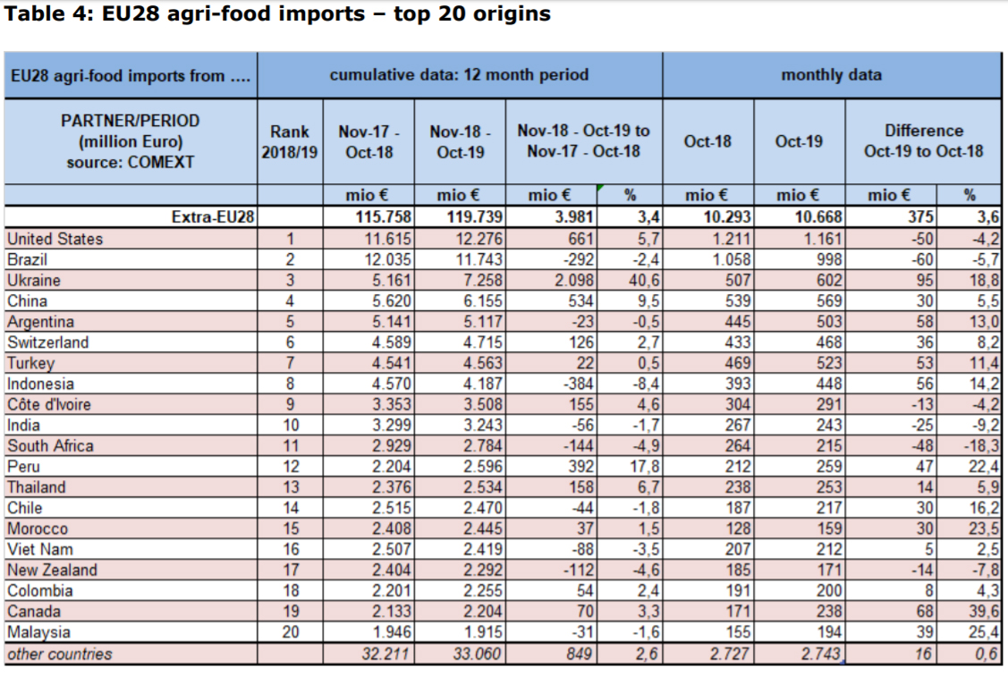Как отмечается в отчете, с ноября 2018 года по октябрь 2019 года экспорт американской сельхозпродукции составил 12,3 млрд евро, из Бразилии - 11,7 млрд евро, из Украины - 7,3 млрд евро. При этом за год самым стремительным был рост экспорта именно из Украины - 41%, или 2,1 млрд евро в денежном выражении.