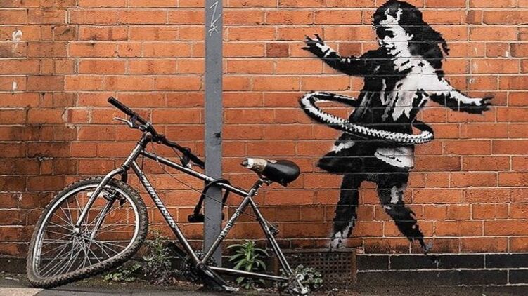 Известный британский художник Бэнкси создал новую картину на улицах Ноттингема, где изобразил девочку, которая крутит обруч около сломанного велосипеда.