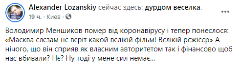"Владимир Меньшиков умер от коронавируса и теперь понеслось: Москва слезам не верит какой великий фильм! великий режиссер" А ничего, что он содействовал как личным авторитетом так и финансово, чтобы нас убивали? Нет? Ну тогда у меня сил нет", - написал Лозанский.