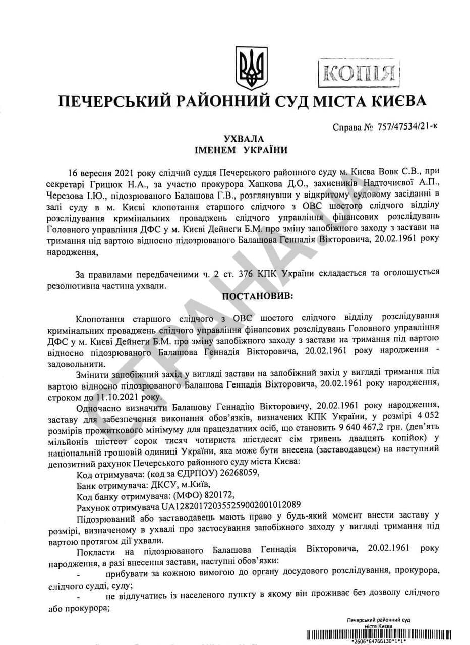 Лидера партии "5.10" Геннадия Балашова отправили в СИЗО с альтернативой залога в 9 640 467 гривен.
