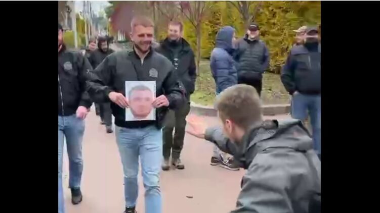 Ультраправые зиговали на портрет главы "Муниципальной стражи" Голосеевского района Киева. Скриншот с видео