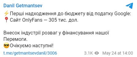 "Первые поступления в бюджет от налога на Google: сайт OnlyFans – 305 тыс. дол. Вклад индустрии развлечений в финансирование нашей победы. Ожидаем следующие", – написал он.