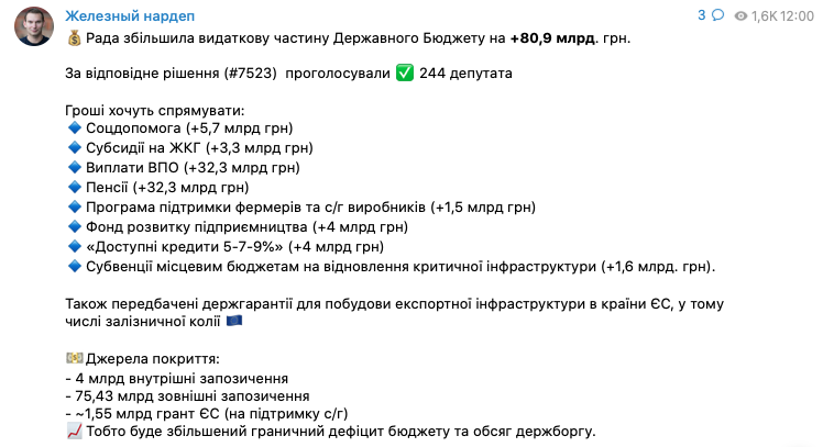 Верховная Рада увеличила расходную часть госбюджета, направив дополнительные 80,9 млрд грн на социальную поддержку населения и восстановление критической инфраструктуры.