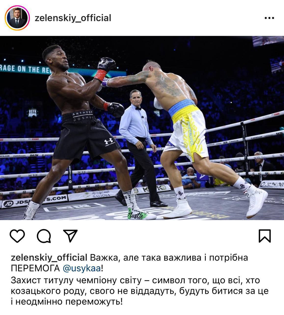 "Тяжелая, но такая важная и нужная Победа Александра Усика! Защита титула чемпиона мира – символ того, что все, кто казацкого рода, своего не отдадут, будут сражаться за это и обязательно победят!", - написал президент Украины Владимир Зеленский на своей странице в Facebook.
