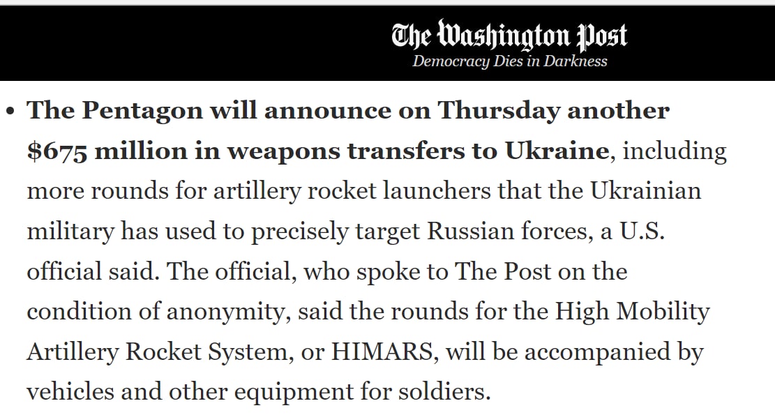 08.25 Сегодня Пентагон объявит о новом пакете военных поставок Украине на 675 миллионов долларов.