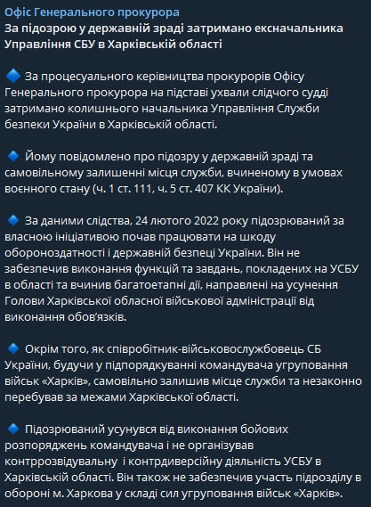 Как сообщается, подозреваемый отстранился от выполнения боевых распоряжений командующего, не организовал контрразведывательную и контрдиверсионную деятельность УСБУ в Харьковской области, не участвовал в обороне Харькова.