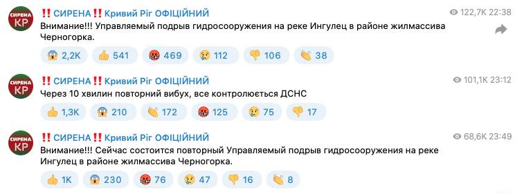 В Кривом Роге провели несколько подрывов гидросооружения на реке Ингулец,  чтобы минимизировать последствия российского ракетного удара по Карачуновской дамбе, из-за чего началась масштабная утечка воды.
