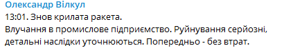 Об этом сообщил глава Криворожской военной администрации Александр Вилкул у себя в телеграм-канале.