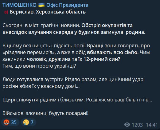 "Сегодня в городе трагические новости. Обстрел оккупантов и в результате попадания снаряда в дом погибла семья. В этом вся низость и подлость России. Утром они говорят о "рождественском перемирии", а уже в обед убивают всю семью. Чем провинились муж, жена и их 12-летний сын? Тем, что они просто украинцы? Люди готовились встретить Рождество вместе, но циничный удар россиян убил их в собственном доме. Искренние соболезнования родным и близким. Разделяем вашу боль и гнев... Военные преступники будут наказаны!", - написал Тимошенко.