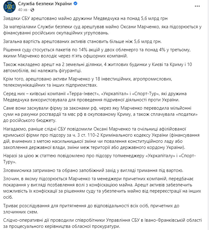 "Среди них – киевские компании "Терра-Инвест", "Укркапитал" и "Спорт-Тур", которые жена Медведчука использовала для проведения подрывной деятельности против Украины", - заявляет СБУ.