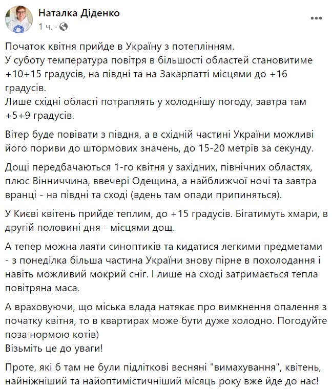 Тепло до +15 и дожди. Синоптик рассказала о погоде в Украине в первые выходные апреля