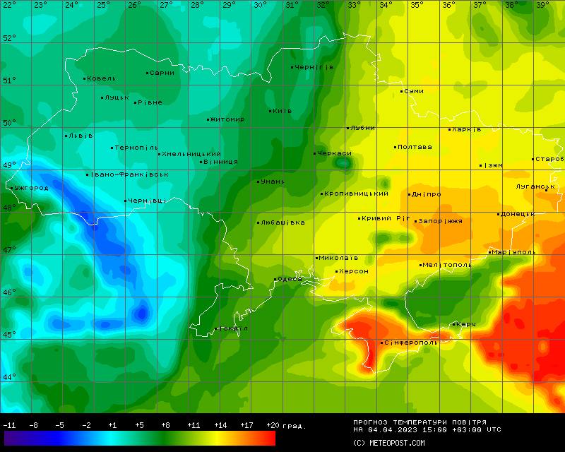 В большинстве центральных областей ожидается +10...+14 градусов, на юге и востоке очень тепло, +14...+18 градусов, в Крыму может достигать и +20 градусов (на Одесщине около +12 градусов).