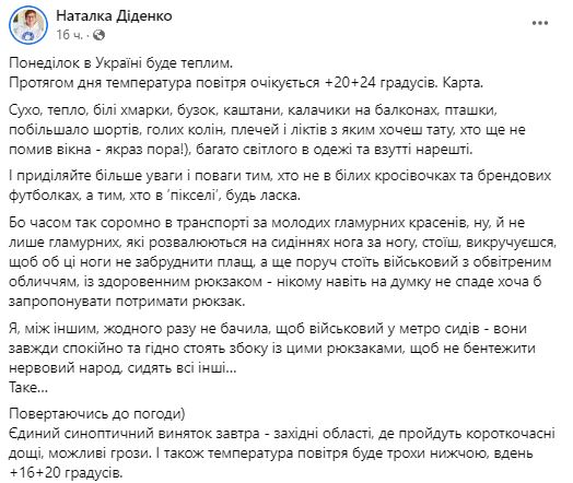 Синоптик Наталья Диденко пишет, что понедельник в Украине будет теплым. В течение дня температура воздуха ожидается +20...+24 градуса.