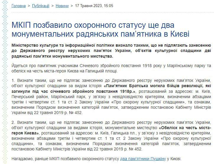 Министерство культуры лишило охранного статуса еще два советских памятника монументального искусства в Киеве: участникам Январского вооруженного восстания 1918 против Центральной Рады в Мариинском парке и обелиск в честь города-героя Киева на Галицкой площади (бывшая площадь Победы).