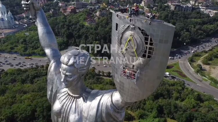 Напомним, демонтаж советского герба на монументе "Родина-мать" начался в воскресенье, 30 июля.