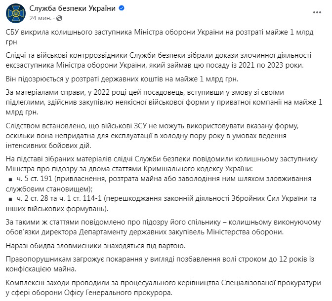 "Следователи и военные контрразведчики Службы безопасности собрали доказательства преступной деятельности экс-заместителя министра обороны Украины, занимавшего этот пост с 2021 по 2023 годы. Он подозревается в растрате государственных средств почти на 1 млрд грн. По материалам дела, в 2022 году это должностное лицо, вступив в сговор со своими подчиненными, осуществило закупку некачественной военной формы у частной компании на почти 1 млрд грн. Следствием установлено, что военные ВСУ не могут использовать указанную форму, поскольку она непригодна для эксплуатации в холодное время года в условиях ведения интенсивных боевых действий", - сказано в посте.