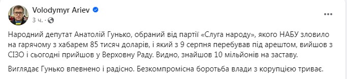 Народный депутат Анатолий Гунько, избранный от "Слуги народа" и 9 августа взятый по стражу по подозрению в получении взятки в 85 тысяч долларов, уже вышел на свободу и сегодня пришел в Верховную Раду.