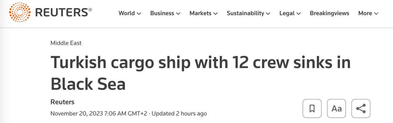Вчера, 19 ноября, у черноморского побережья Турции во время шторма затонуло турецкое грузовое судно с 12 членами экипажа на борту. Властям не удалось связаться с экипажем.