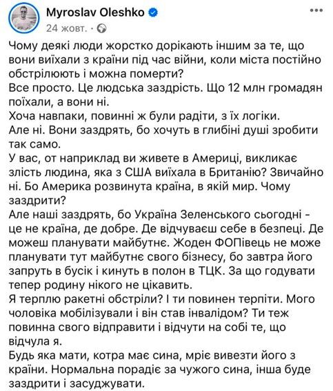 "Почему некоторые люди жестко упрекают других в том, что они уехали из страны во время войны, когда города постоянно обстреливают и можно умереть? Все просто. Это человеческая зависть. Что 12 млн граждан уехали, а они нет. Наши завидуют, потому что Украина Зеленского сегодня – это не страна, где хорошо. Где чувствуешь себя в безопасности. Где можно планировать будущее. Ни один ФОПовец не может планировать здесь будущее своего бизнеса, потому что завтра его запрут в бусик и бросят в плен в ТЦК.