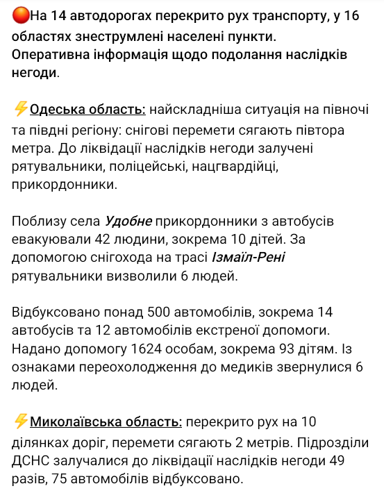 • Одесская область - самая сложная ситуация на севере и юге региона. Снежные сугробы достигают полутора метров. К ликвидации последствий непогоды привлечены спасатели, полицейские, нацгвардейцы, пограничники. Вблизи села Удобное пограничники из автобусов эвакуировали 42 человека, в том числе 10 детей. С помощью снегохода на трассе Измаил-Рени спасатели освободили шесть человек. Отбуксировано более 500 автомобилей, в том числе 14 автобусов и 12 автомобилей экстренной помощи. Оказана помощь 1624 людям, в том числе 93 детям. С признаками переохлаждения к медикам обратились шесть человек;