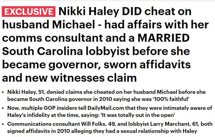 Издание предоставило доказательства того, что Хейли имела романы со своим консультантом по связям и лоббистом из Южной Каролины до того, как стала губернатором Южной Каролины в 2010 году.