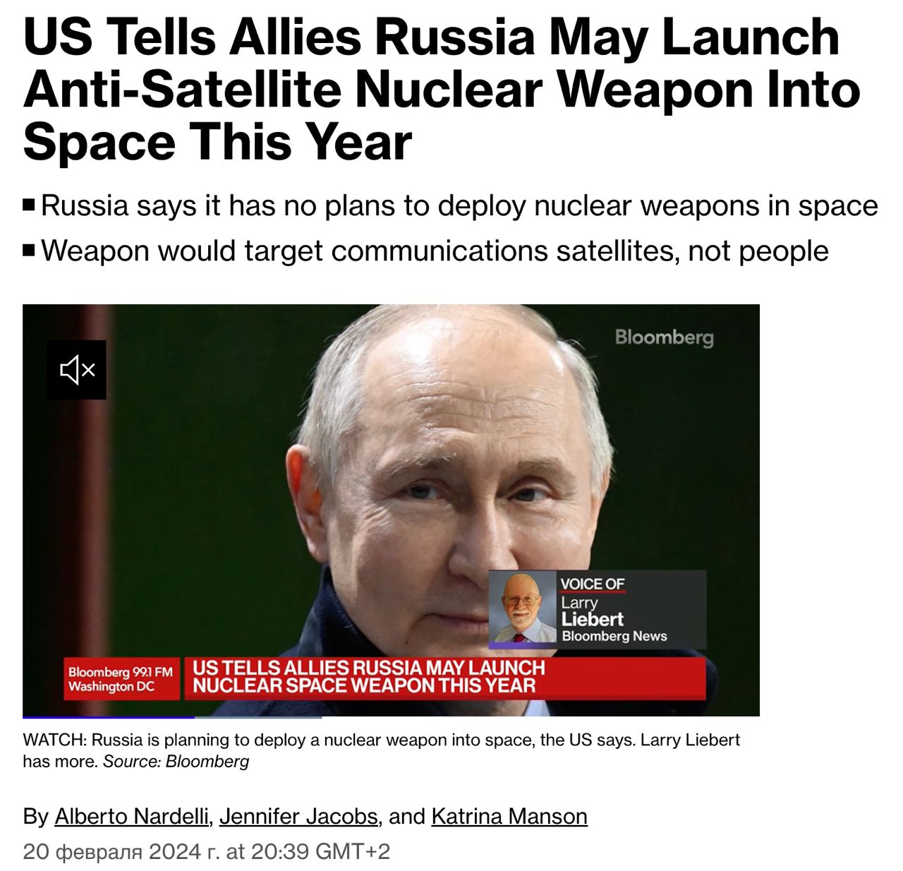 Bloomberg пишет о стремление России создать орбитальное ядерное оружие, которое подчеркивает начало новой космической гонки.