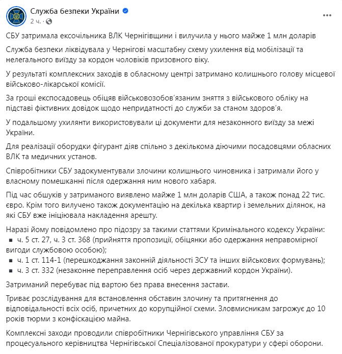 СБУ подтвердила информацию журналистов. Как сообщается в Фейсбуке Службы, мужчина уже в статусе главы областной комиссии наладил схему уклонения от мобилизации и выезда за границу уклонистов, привлек к ней действующих сотрудников ВВК и медучреждений.