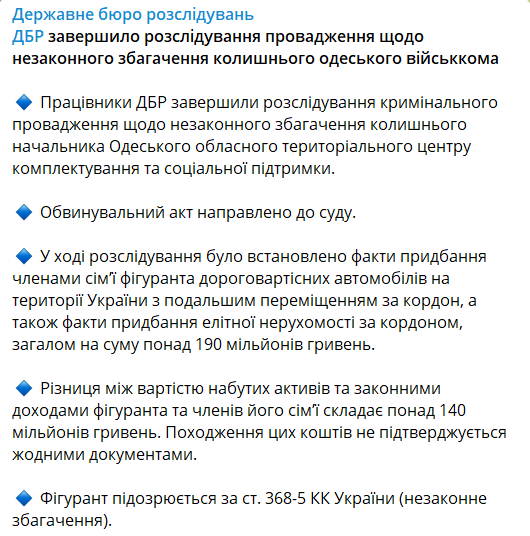 ГБР завершило расследование по делу о незаконном обогащении бывшего одесского военкома Борисова