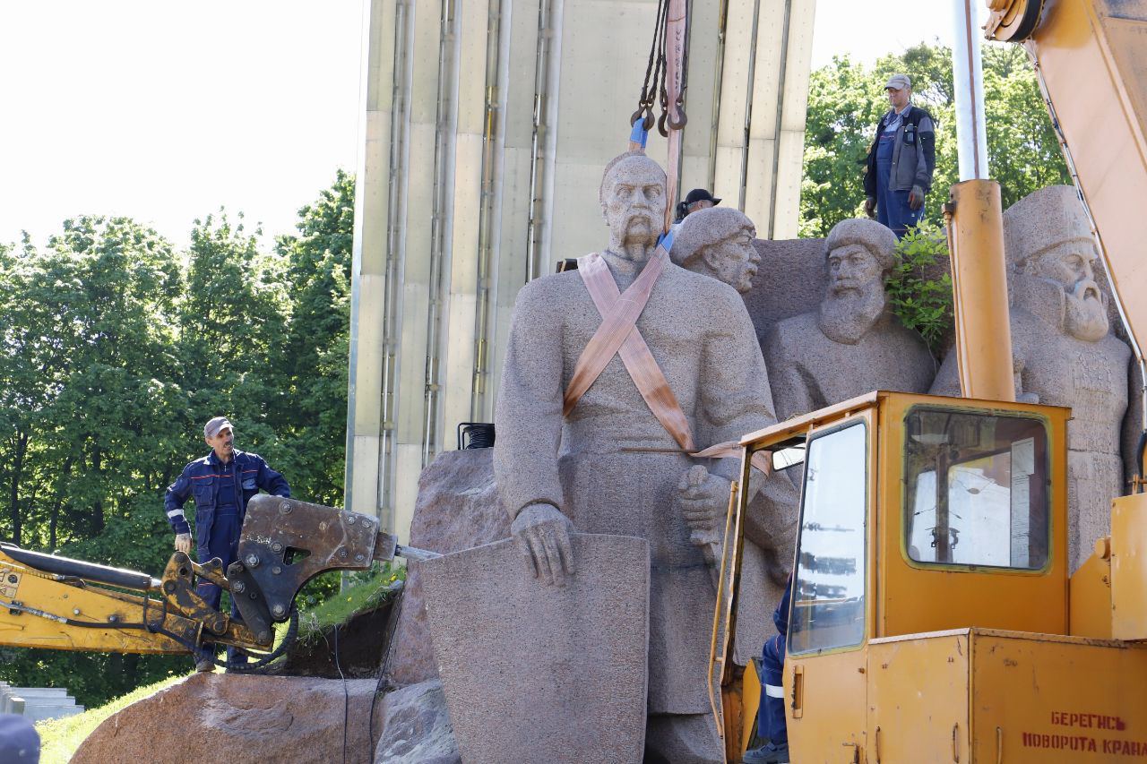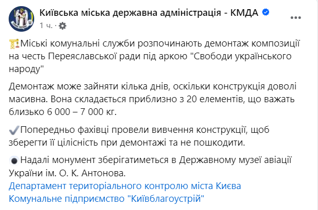 В Киеве начался демонтаж композиции в честь Переяславской рады под Аркой Дружбы народов (ныне - Арка Свободы украинского народа).