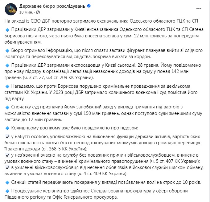 "Бюро получило информацию, что после уплаты залога фигурант планировал выйти из следственного изолятора и скрываться от следствия, в том числе выехать за границу. Сотрудники ГБР задержали экс-чиновника в Киеве сегодня, 28 мая. Ему сообщено о новом подозрении в организации легализации незаконных доходов на сумму более 142 миллионов гривен (ч. 3 ст. 27, ч.3 ст. 209 УК Украины)", - сказано в публикации ведомства.