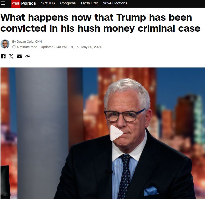 "11 июля Дональду Трампу объявят меру наказания по делу, где он уже признан виновным в финансовых махинациях. Если ему назначат тюремное заключение, он в теории может избраться президентом даже из тюрьмы", — резюмирует CNN.