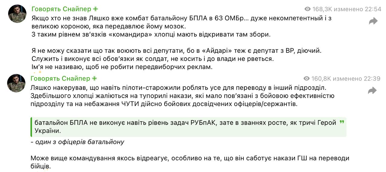"Очень некомпетентный и с большой короной, которая передавливает ему мозг. С таким уровнем связей "командира" ребята должны открывать там сборы (донатов - Ред.)... Ляшко наруководил, что даже пилоты-старожилы делают все для перевода в другое подразделение. В основном ребята жалуются на тупорылые приказы, мало связанные с боевой эффективностью подразделения, и на нежелание слушать действительно боевых опытных офицеров/сержантов", - написал Бунятов.