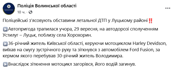 По данным правоохранителей, 36-летний военнослужащий разбился на мотоцикле вчера, 29 сентября, вблизи села Хорохорин Луцкого района.