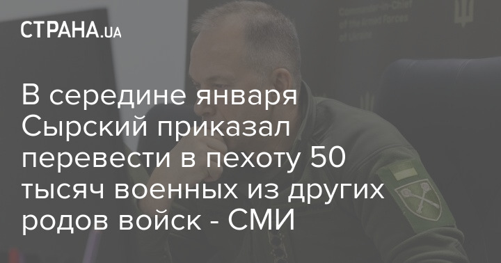 Главнокомандующий ВСУ Александр Сырский подписал приказ о переводе в пехоту примерно 50 тысяч военных всех родов и видов войск для начала ротаций в боевых бригадах. Приказ был отдан 11 января.