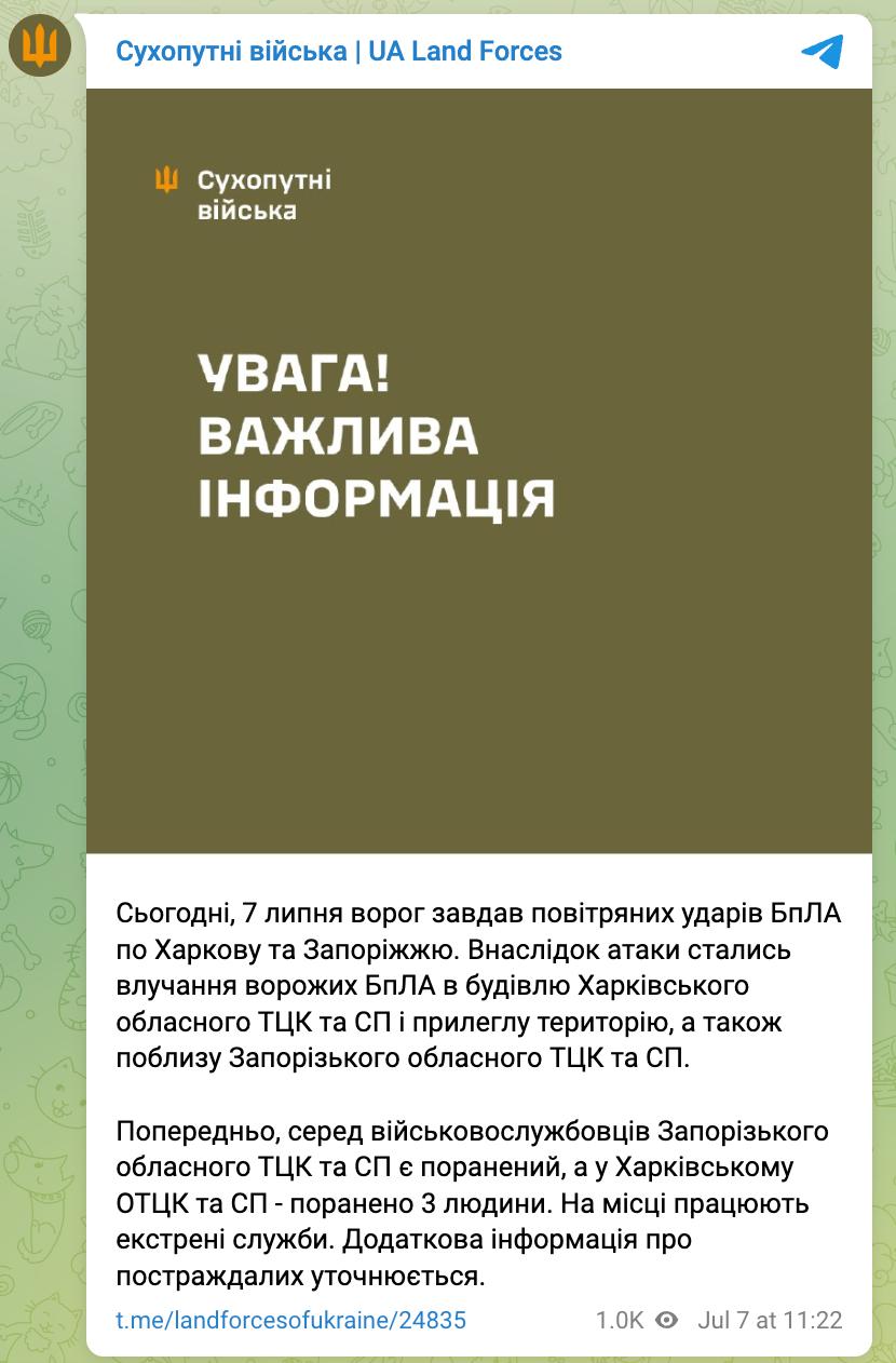 Армия РФ нанесла удар по ТЦК Харькова и Запорожья, ранены военные