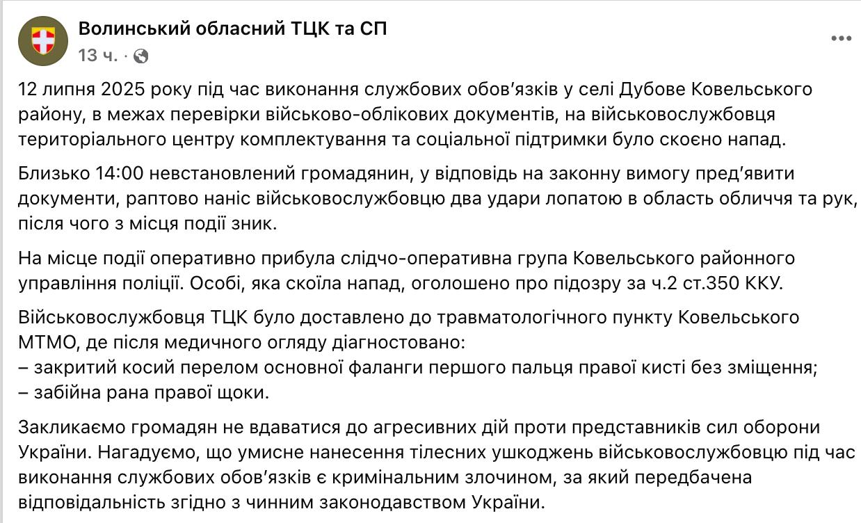 По предоставленной информации, инцидент произошел в селе Дубовое Ковельского района во время проверки военно-учетных документов.