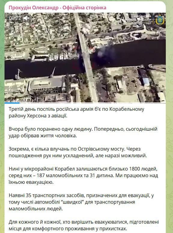 16:19 Херсонская ОВА публикует видео сегодняшних ударов российскими КАБами по мосту в Корабельном районе Херсона. Видны прилёты непосредственно по мосту. По данным ОВА, он получил сильные разрушения, но проезд по нему все ещё возможен.