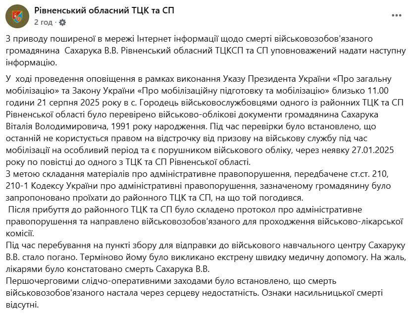 Вскоре после резонанса в соцсетях Ровенский ТЦК заявил, что мобилизованный Сахарук погиб из-за сердечной недостаточности после успешно пройденной ВВК, и его не били.