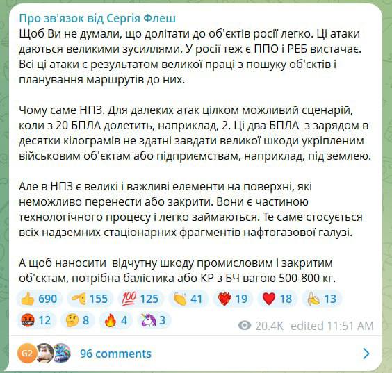 "Эти два БПЛА с зарытом в десятки кило не могут нанести серьёзный ущерб укрепленных военным объектам или предприятиям, например, под землей. Но у НПЗ есть большие и важные элементы на поверхности, которые невозможно перенести или закрыть. Они являются частью технологического процесса и легко поджигаются. То же касается всех надземных стационарных фрагментов нефтегазовой отрасли. А чтобы наносить ощутимый вред промышленным и закрытым объектам, нужна баллистика или крылатые ракеты с боезапасом весом 500-800 кило", - пишет "Флэш".