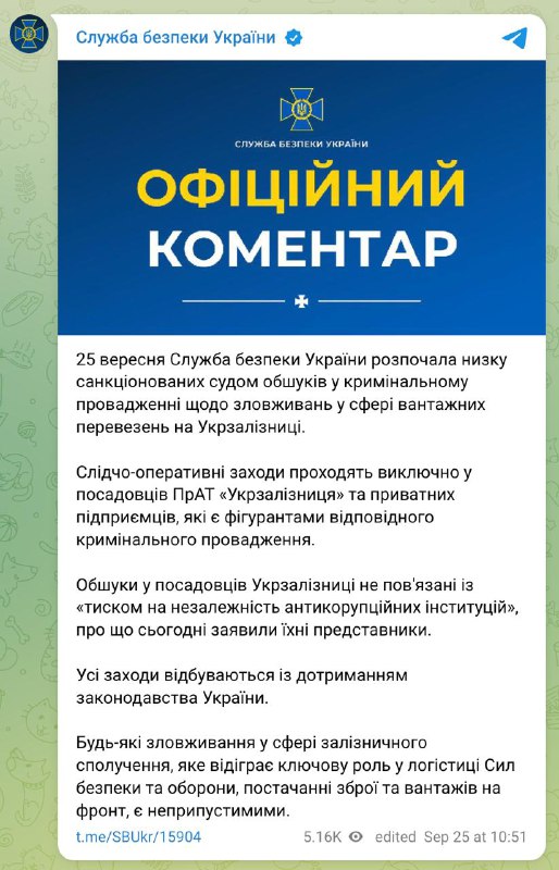 "Национальное бюро информирует, что сегодня СБУ проводит следственные действия у бывших детективов Национального бюро (в настоящее время действующие работники "Укрзализныци"). Вероятно, они связаны с их предыдущей деятельностью над расследованиями в составе следственных групп, разоблачающих организованные преступные группы на государственных предприятиях и в органах государственной власти, в том числе и СБУ. Такие действия могут свидетельствовать об усилении системного давления на независимость антикоррупционных институтов", - считают в НАБУ.