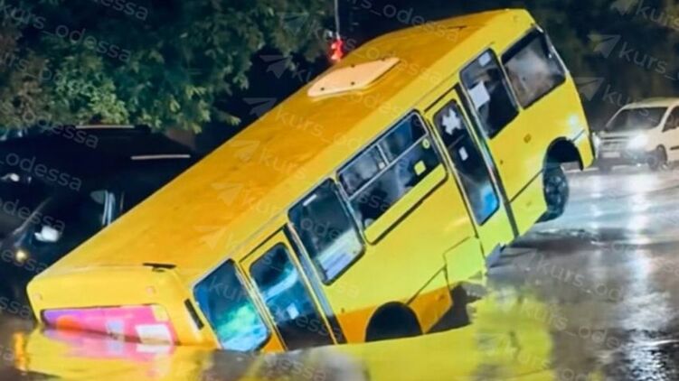 Маршрутный автобус в Одессе ушел под землю из-за прорыва теплотрассы на фоне ливня, бушевавшего над городом в течении всего дня.