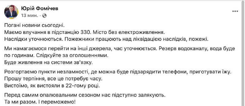 «Из-за массированного удара, который враг нанес сегодня, были поражены важные энергетические объекты, что повлекло за собой системную аварию в сети и привело к отключению сразу 307 тысяч потребителей в нескольких районах области. К сожалению, имеющейся в энергосистеме мощности недостаточно, чтобы запитать сразу всех потребителей, поэтому мы вынуждены прибегнуть к крайним мерам», — говорится в сообщении компании.