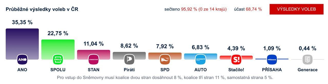 Кроме того, довольно вероятно, у них могут появиться союзники из партии Motoristé sobě ("Автомобилисты для себя") - это евроскептики, выступающие против ограничений на топливные автомобили и "зеленой" повестки. У нее 6,8% голосов, что дает вероятной "коалиции Бабиша" почти 50% в парламенте страны. С учетом перераспределения голосов непрошедших - это большинство.