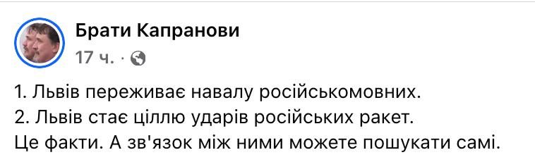 Писатель Виталий Капранов фактически обвинил в недавнем ракетном ударе по Львову русскоязычных беженцев. "Львов переживает нашествие русскоязычных. Львов становится целью ударов российских ракет. Это факты. А связь между ними можете поискать сами", - написал он в Facebook.
