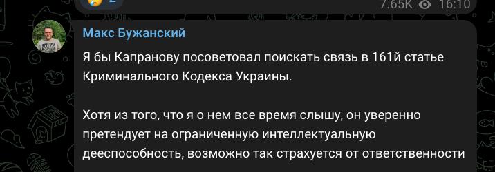 "Я бы Капранову посоветовал поискать связь в 161й статье Криминального Кодекса Украины (о нарушении равноправия граждан - Ред.). Хотя из того, что я о нем все время слышу, он уверенно претендует на ограниченную интеллектуальную дееспособность, возможно так страхуется от ответственности", - написал нардеп Максим Бужанский.