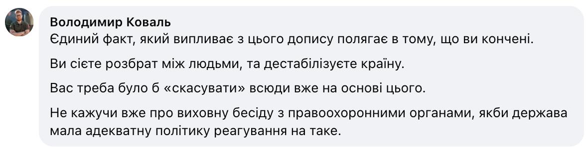 "Единственный факт, который вытекает из этого поста, заключается в том, что вы — конченый. Вы сеете рознь между людьми и дестабилизируете страну. Вас следовало бы "отменить" повсюду уже на основании этого. Не говоря уже о воспитательной беседе с правоохранительными органами, если бы государство имело адекватную политику реагирования на подобное", - написал военнослужаший и блогер Владимир Коваль.