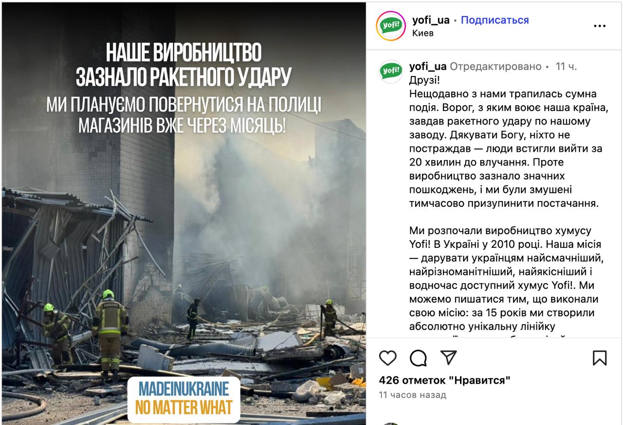 10.06 Производитель хумуса Yofi сообщил о прилете по своему заводу, из-за чего поставки продукции приостановлены как минимум на месяц.