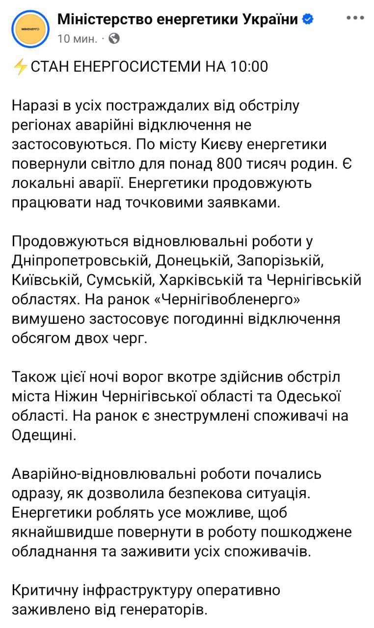 10:50 После вчерашнего обстрела графики аварийных отключений света действуют только в Черниговской области.