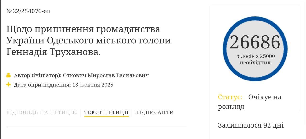 Петиция с требованием лишить гражданства Украины мэра Одессы Геннадия Труханова менее чем за сутки набрала более 25 тысяч подписей, необходимых для рассмотрения президентом Владимиром Зеленским.